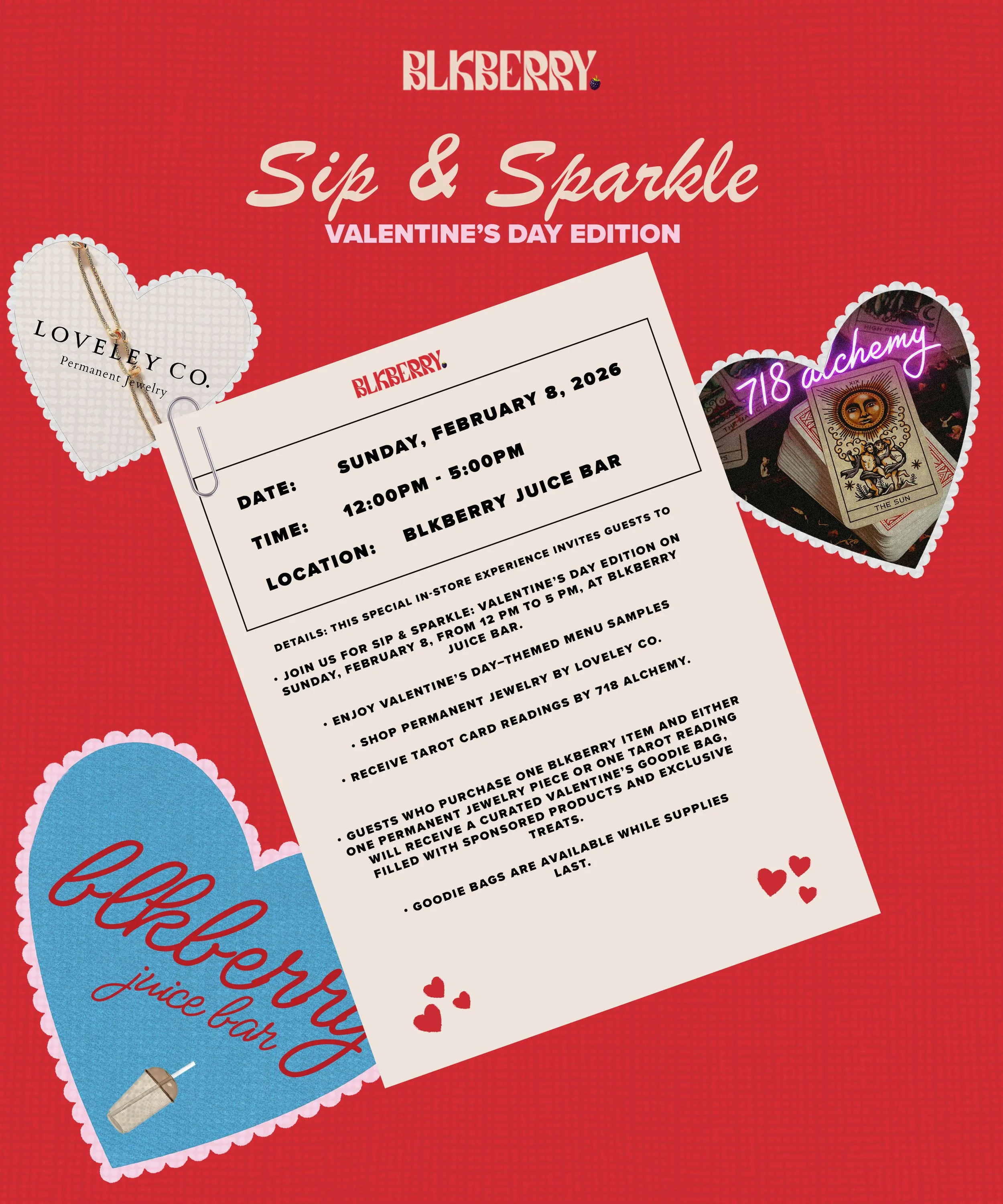 Join us Saturday, February 8th for a special Valentine’s Day Sip & Sparkle at Blkberry Juice Bar! Indulge in our limited-time Valentines menu, permanent jewelry by Loveley Co. and Tarot card readings by 718 Alchemy.